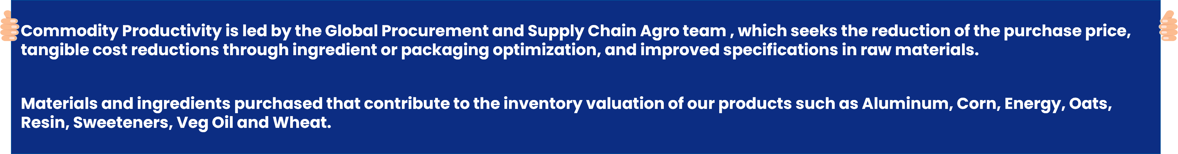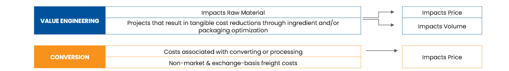 - Value Engineering: Projects that result in tangible cost reductions through ingredient and/or packaging optimization. Impacts Raw Material