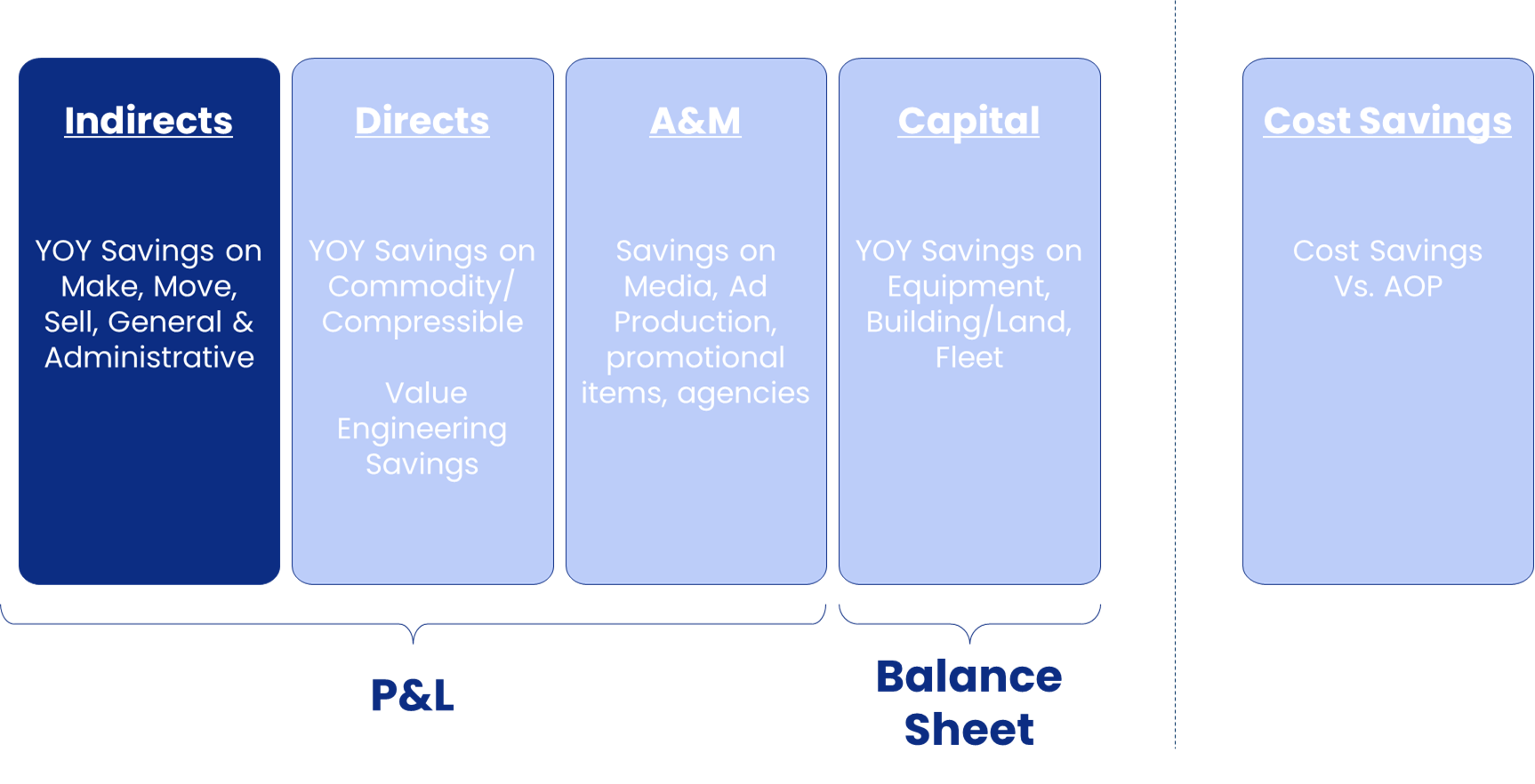 Indirects Productivity refers to savings related to the costs in the Make/Move/Sell/G&A accounts. It is also referred to as "Operations Productivity" and impacts various operating expenses YoY savings amount and as a percentage of managed indirects spend.